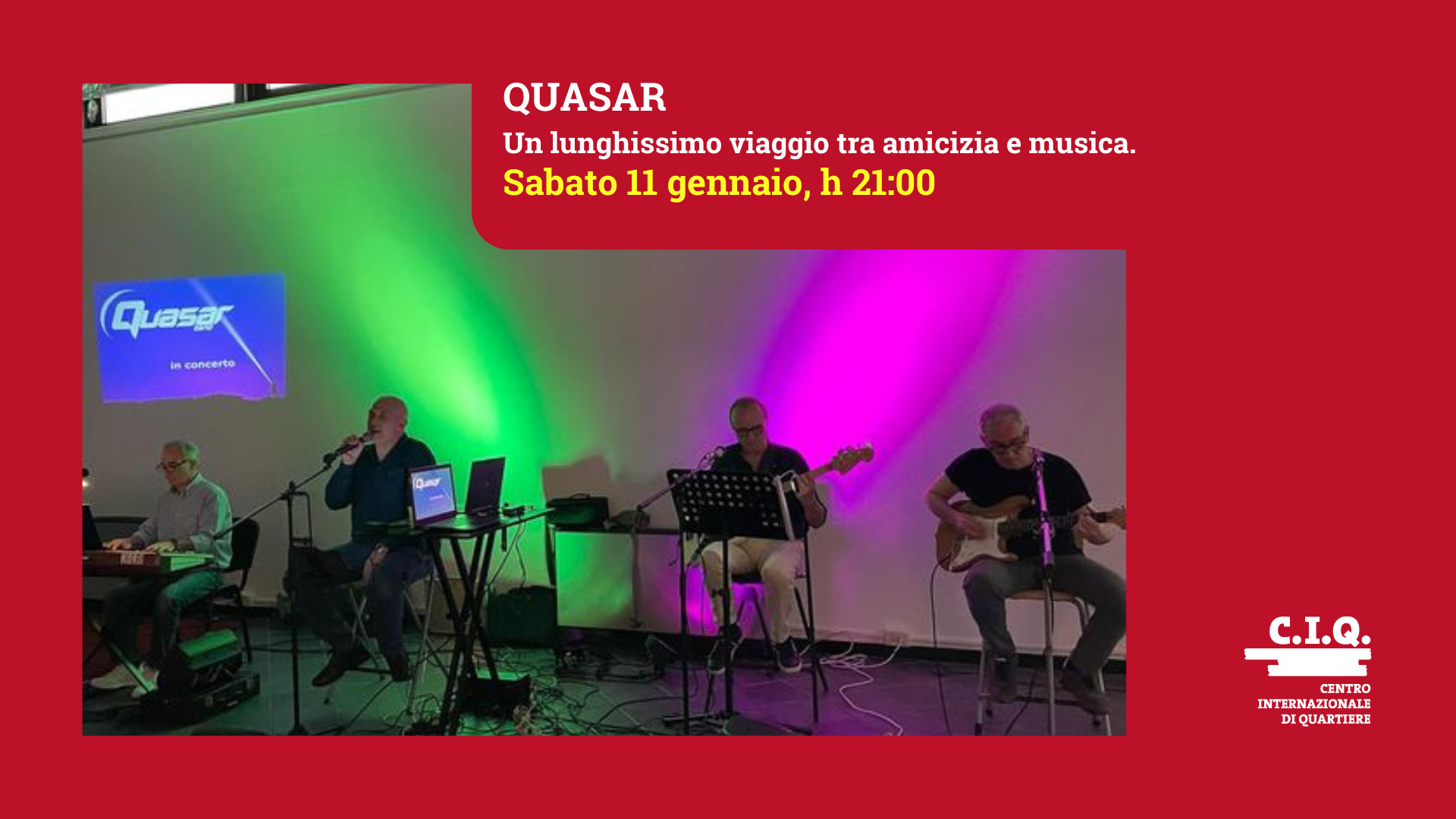 Il progetto Quasar band viene avviato nel 1981 da un gruppo di amici che, spinti dalla comune passione per la musica, decisero di creare un repertorio originale con testi basati su esperienze di vita perfettamente integrate nel contesto storico degli anni ’80. Ne scaturì una lunga serie di esibizioni live di successo. Dopo quasi mezzo secolo hanno recuperato quel repertorio trovando molte convergenze tra i temi trattati allora e le realtà odierne e hanno dato vita ad un nuovo spettacolo in cui ci raccontano e rivivono l’ultimo decennio della “modernità” attraverso musica live, aneddoti e proiezioni video.