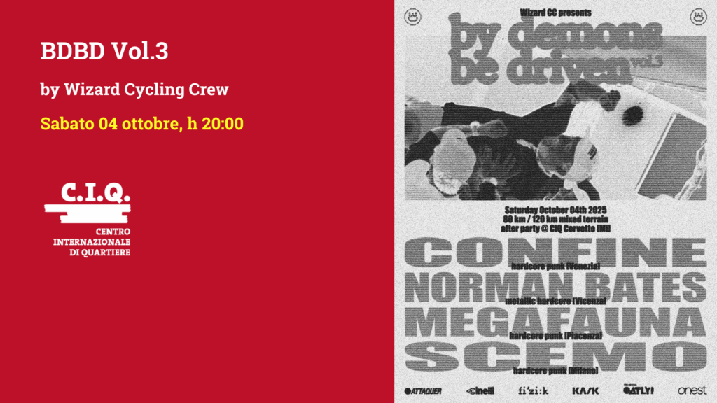 Avremo sul palco i Confine (Punk Hardcore – Venezia), Norman Bates (Metallic Hardcore – Vicenza), Megafauna (Punk Hardcore – Piacenza) e Scemo (Hardcore Punk – Milano).