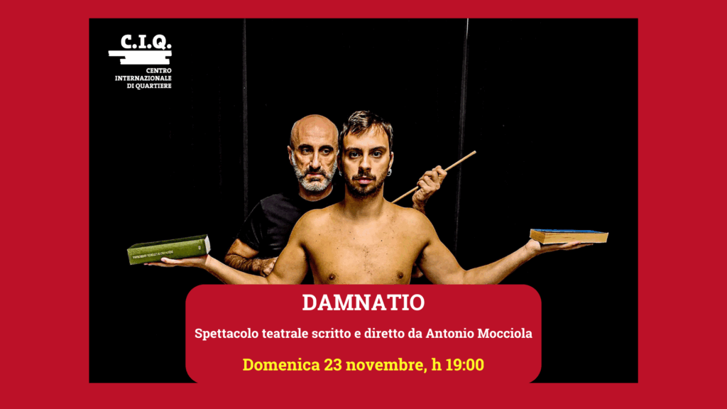 “Damnatio”, spettacolo inedito nato dalla fertile penna di Antonio Mocciola, è un affascinante viaggio nelle perversioni della mente umane, e negli allucinanti dogmi della chiesa, qui messi alla berlina assieme al suo protagonista, un intenso e credibile Massimo Leonardo Villucci, completamente nudo e legato per tutto lo spettacolo, in balia di un glaciale Samuele Valenti.